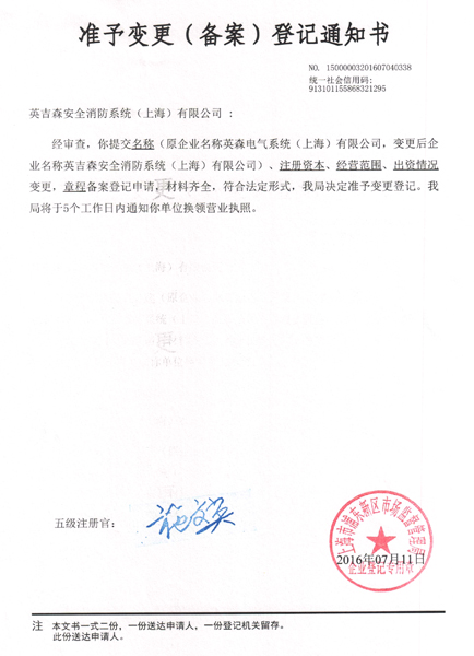 由于我公司業(yè)務(wù)擴(kuò)展的需求,公司已經(jīng)由:“英森電氣系統(tǒng)(上海)有限公司” 更名為:“英吉森安全消防系統(tǒng)(上海)有限公司”,公司僅僅是名稱的更改,法人及公司架構(gòu),經(jīng)營模式等均無變化。