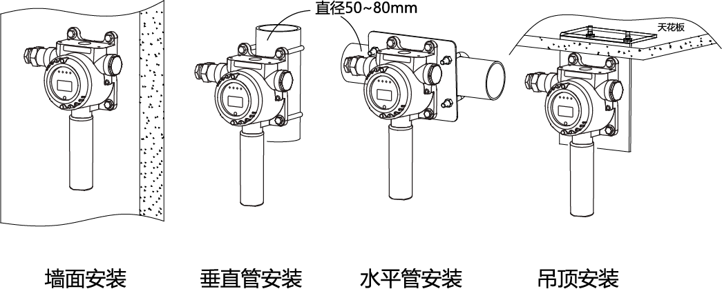 探測器的安裝應(yīng)根據(jù)國家標(biāo)準(zhǔn)GB50493-2009中的相應(yīng)規(guī)定及設(shè)計(jì)圖紙確定的位置安裝。應(yīng)選在潛在泄漏點(diǎn)或氣體聚積處,建議安裝在可能有氣體泄漏的地點(diǎn)處1米范圍內(nèi)(視氣體種類或高或低),這樣探頭實(shí)際反應(yīng)速度較快。儀器的安裝位置還應(yīng)綜合考慮空氣流動(dòng)的速度、方向、潛在泄漏源的相對位置和通風(fēng)條件而定,并便于維護(hù)和標(biāo)定。